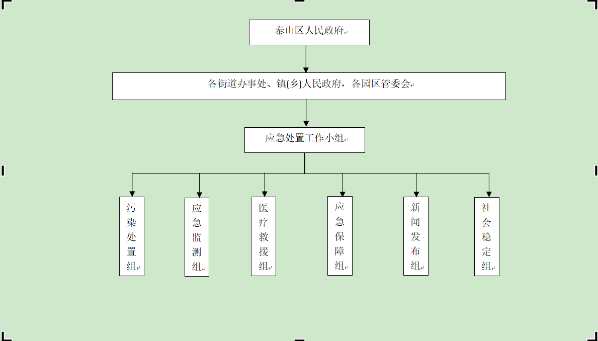 区政府是全区突发环境事件应急管理工作的最高行政领导机构,依法设立泰山区突发环境事件应急指挥机构(详见附件2)。泰山区突发环境事件应急指挥机构的主要职责是贯彻落实党中央、国务院、省委、省政府和市委、市政府、区委、区政府关于环境应急工作的方针政策、指示和要求;统一协调应急处置与救援工作;指导各街道办事处、镇(乡)人民政府,各园区管委会及有关部门做好突发环境事件应急工作。泰山区突发环境事件应急指挥机构办公室设在市生态环境局泰山分局,作为全区突发环境事件应急管理工作的日常工作机构。必要时,区政府可以派出工作组指导相关工作。