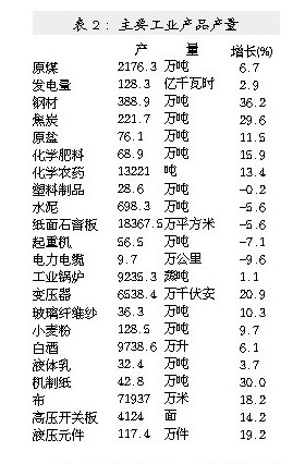 近八成工业产品产量增长。在全市统计的150余种工业产品中,同比增长的占78%以上,增长超过30%的有39种,占26%,水泥、砖、铸铁件等部分高耗能产品产量下降(见表2)。