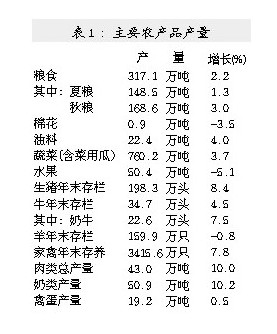 主要农牧产品产量平稳增长。全市农作物总播种面积955.1万亩,比上年增长0.8%。其中,粮食作物播种面积651.7万亩,增长0.6%;油料作物播种面积77.5万亩,增长2.3%;棉花播种面积10.7万亩,减少6.5%。大多数农产品产量有所提高(见表1)。
