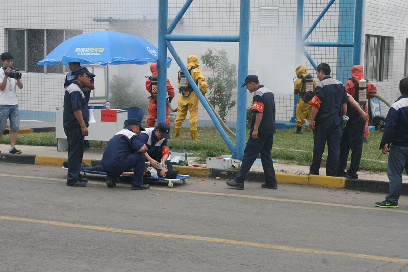 演练共设5个科目,分别为“安全警戒与疏散”、“液氨泄漏水幕隔离、稀释”、“液氨泄漏堵漏”、“液氨中毒医疗救护”、“液氨泄漏环境监测”。演练中,治安救护队对厂区戒严,进行道路管制,疏散职工;120急救医生对中毒人员实施抢救,救援人员穿戴防化服、防毒面具,利用现场消防水炮进行液氨泄漏水幕隔离、稀释,携带专用器材迅速奔赴现场进行液氨泄漏堵漏;公安消防大队前来支援战斗,环境保护人员对大气、对外排水进行监测。经过30分钟的努力“救援”,“险情”被妥善处理,演练取得成功。事故处理结束后,解除警戒,并立即成立事故调查组和设备抢修组,调查本次事故的原因,对事故发生设备进行检查抢修。