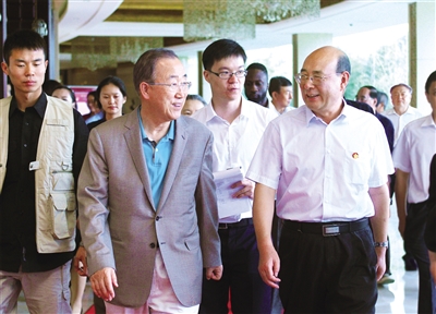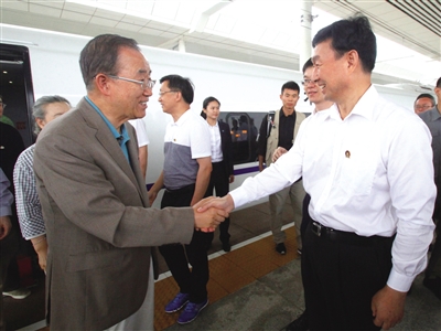 9月4日,联合国秘书长潘基文在中国常驻联合国代表团大使刘洁一陪同下,来我市参观访问。市委书记、市人大常委会主任李洪峰,省外办主任薛庆国,市委副书记、市长王云鹏陪同有关活动。