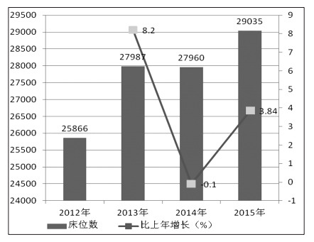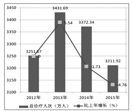 2015年,全市县级(不含区)医院诊疗人次达205.99万人次,比2014年减少13.54万人次;入院人数49.98万人,比2014年减少0.61万人;病床使用率78.03%,比2014年降低了6.72个百分点。