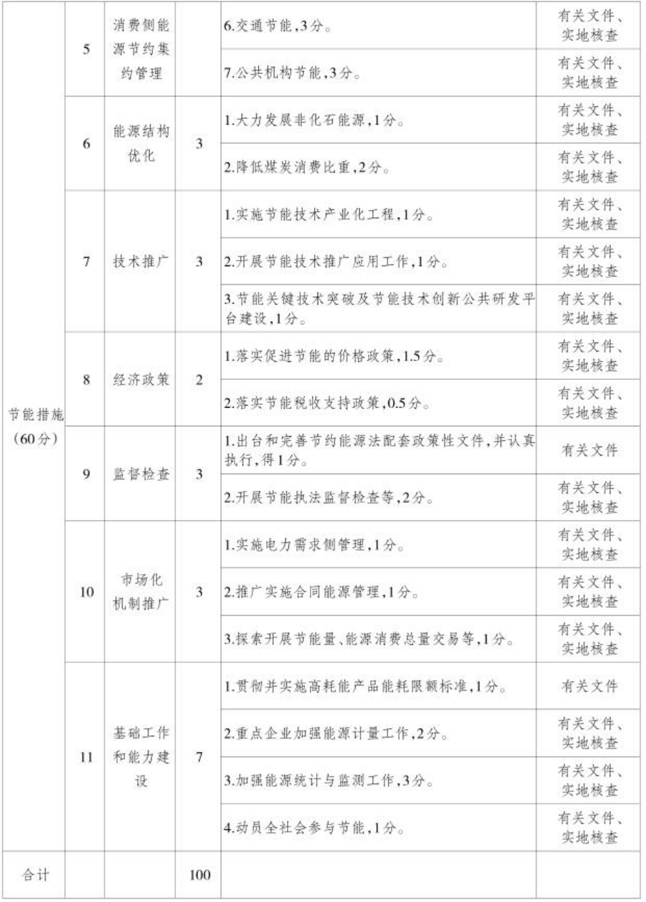 2.节能措施落实情况指标为定性考核指标,满分为60分。主要包括目标责任、结构调整、重点工程、消费侧能源节约集约管理、能源结构优化、技术推广、经济政策、监督检查、市场化机制推广、基础工作和能力建设等10个方面内容。