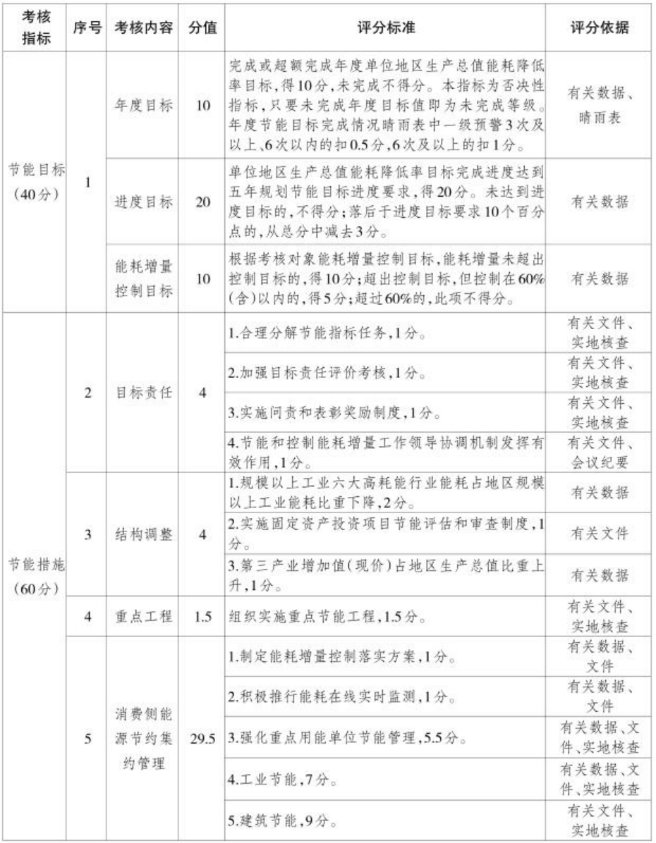 1.节能目标完成情况为定量考核指标,满分为40分。以市政府确定的各县(市、区)万元地区生产总值能耗降低年度和进度目标、能耗增量控制目标为基准,依据市统计局核定的年度指标完成情况进行评分。