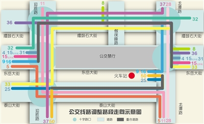 由易初莲花发车后,沿东岳大街运行至迎胜路后,不再继续向东运行,而是左转沿迎胜路向北运行至擂鼓石大街路口,由擂鼓石大街东行至龙潭路与擂鼓石大街路口后,右转沿龙潭路南行至东岳大街左转恢复原线路运行。线路调整后,不再经过新汽车站、建设大厦、公交公司、火车站4个公交站点。