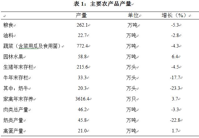 畜牧业产品产量波动明显。年末生猪、牛、羊分别存栏215.6万头、33.3万头和181.2万只,分别比上年下降4.5%、17.7%、3.2%;全年出栏猪、牛、羊374.1万头、18.9万头和290.3万只,下降5.9%、5.9%、9.4%,猪、牛、羊肉产量27.9万吨、2.6万吨和3.0万吨,下降5.8%、6.0%、9.0%;牛奶产量45.8万吨,下降22.8%。家禽存栏3616.4万只,增长3.7%,出栏9185.3万只,增长5.1%,禽肉产量12.2万吨,增长4.7%,禽蛋产量21.0万吨,增长1.7%。