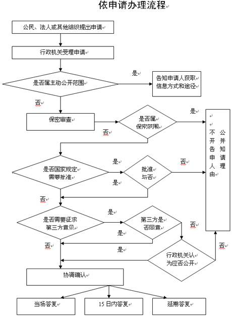 对申请人提出的政府信息公开申请,本机关将根据不同情况分别作出答复,详见本机关处理政府信息公开申请流程图。