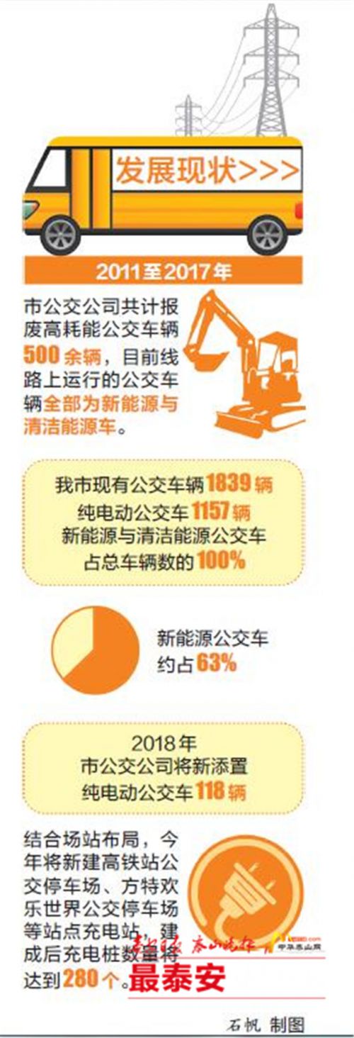 从2010年开始,市公交公司购置“油-电混合动力”车40辆,2011年至2016年,陆续购置清洁能源公交车641辆,插电式混合动力新能源车153辆,2015年至2017年,又分别购置纯电动公交车540辆、115辆、350辆。随着新能源公交车比例的增加,高耗能高排放的燃油公交车也逐渐退出公交运营市场。据统计,2011年至2017年,市公交公司共计报废高耗能公交车辆500余辆,目前,线路上运行的公交车辆全部为新能源与清洁能源车。应用新能源公交车,目前泰安公交的步伐已经走在了全省的前列。