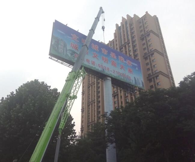 该大型立柱广告为双面“高炮”广告,高度20余米,单面面积108平方米,总面积216平方米。为保证行人及周边居民的安全需分两次切割。上面板面和部分立柱被整体切割下来吊装放置地面,剩余部分从立柱根部一次性切割完毕并吊装放置路面后,再进行分解清运。