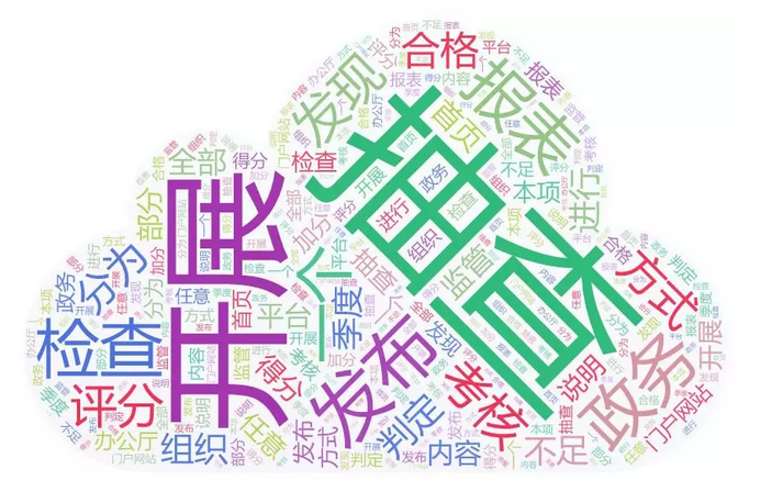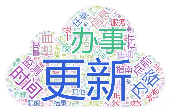 分别对检查指标和监管工作年度考核指标进行关键词分析,剔除“政府”“网站”“指标”“否决”等关键词,发现在检查指标中,“更新”“办事”“时间”“内容”“栏目”等关键词的词频较高,词云图如下: