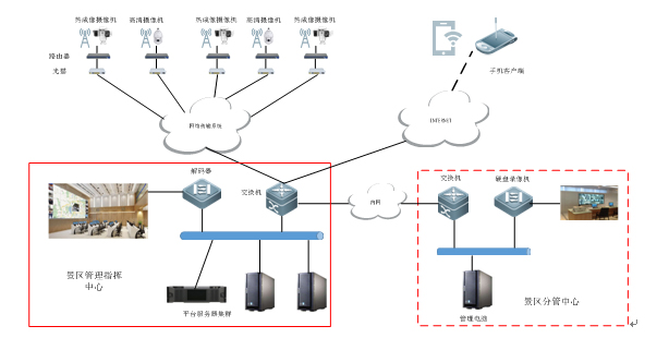 前端通过运营商专网传输到各防火指挥中心,监控前端、各管理区、数控中心三级联网、联动报警,实现视频图像、报警信息、坐标定位的上墙显示,实时监测、报警、控制。