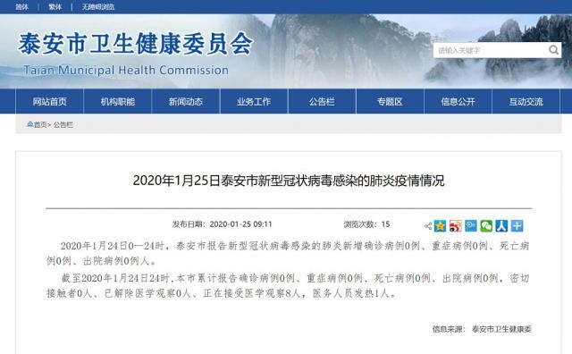 2020 年 1 月 24 日 0 — 24 时,泰安市报告新型冠状病毒感染的肺炎新增确诊病例 0 例、重症病例 0 例、死亡病例 0 例、出院病例 0 例人。