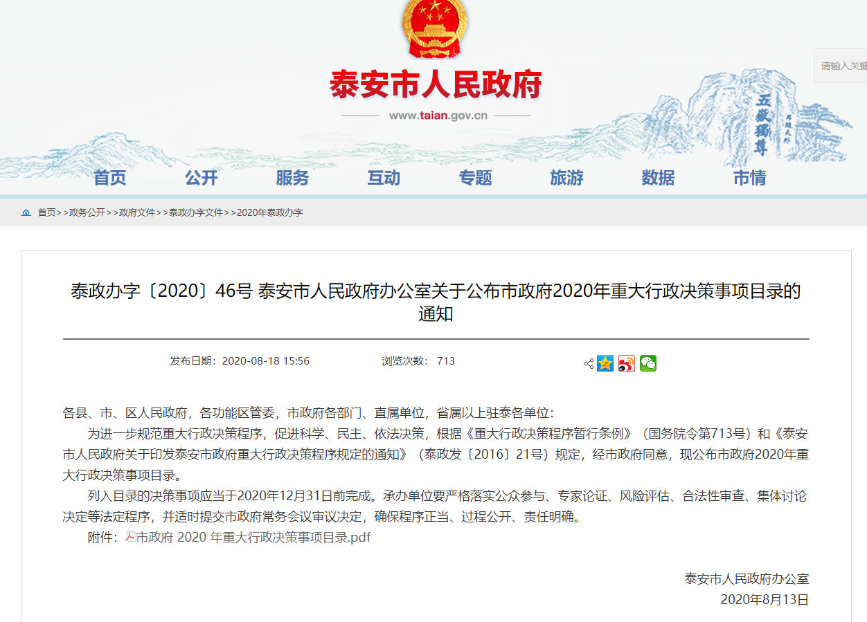 一是推进重大行政决策公开。为推进行政决策公开,落实好公众参与、专家论证、风险评估、合法性审查、集体讨论决定等决策公开程序,市司法局组织各功能区管委会、市直有关部门单位结合职责权限和本地实际提报市政府重大行政决策事项,共收到22个部门提报的18个事项,并结合市政府年度重点工作任务进行了充分研究和论证,最终确定《国民经济和社会发展第十四个五年规划纲要》、《泰安市国土空间总体规划(2020-2035)》等10件重大行政决策事项,及时通过网站、媒体对社会公开。