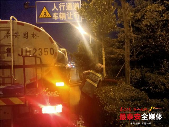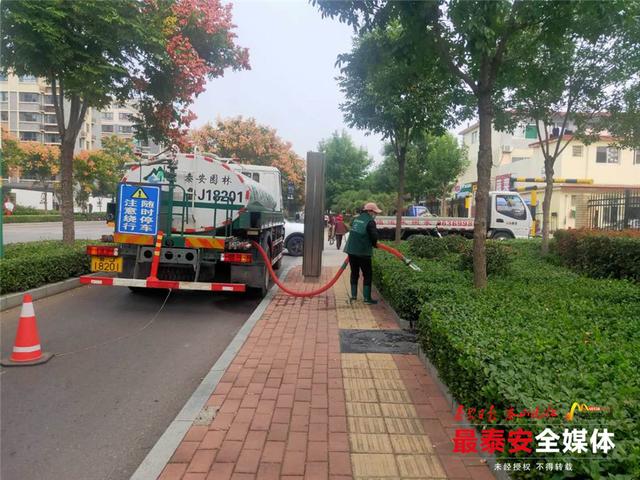 9日下午,记者在泰山大街看到,园林养护工人正在为道路绿化带里的树木浇水。“近段时间天气持续干旱少雨,让城市绿地也‘喊渴’了。我们园林人便都投入到抗旱保苗工作中了。基本是每天早晨提早上班,晚上延长作业时间,这样通过合理调整工作时间,避免高蒸发时段进行浇灌作业。”园林养护工人告诉记者,他们进行浇灌作业主要以洒水车机动喷洒为主,绿地管道定点浇水为辅,根据路段的土壤干湿情况,具体问题具体对待,但都必须达到“每浇必透”的精细养护目标。