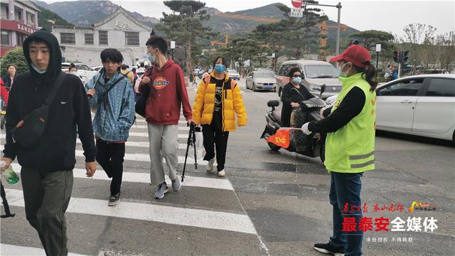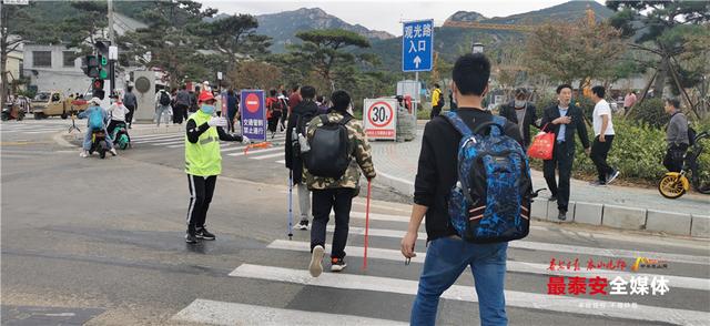 2日上午,泰安日报社·最泰安全媒体记者在环山路与红门路交会处看到,文明交通志愿者手举小红旗,引导上山游客走斑马线。