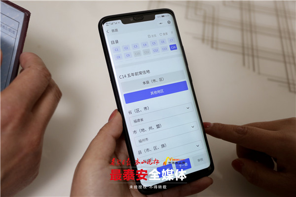 “您好,我是开元社区的人口普查指导员,正在进行第七次全国人口普查长表入户登记工作。您家被抽中需要进行长表登记,我们需要登记的个人信息较多,涉及到就业、住房、婚姻状况等,请您耐心配合……”22日,记者见到韩晓明时,已是上午10点半,处理完社区的工作,她匆忙赶到了绿地公馆开始了长表入户登记工作。身穿红色马甲、佩戴口罩和工作证,在与住户简短的寒暄过后,韩晓明开始了长表的信息登记。每获得一个信息,她就在手持电子设备上仔细进行录入,20分钟左右,相关登记工作顺利完成。当天首个长表入户一次性答“到”也让韩晓明十分开心。