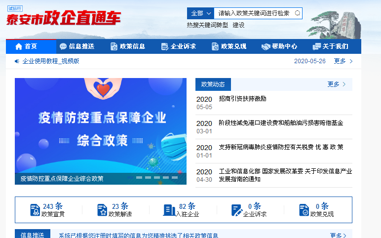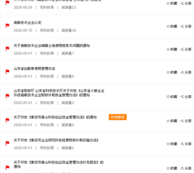 二是聚焦现实,实现政策线上发布。根据泰安市工业经济发展指挥部政策研究攻坚组对于科技创新政策的需求,梳理出高新技术企业认定、企业研究开发财政补助、中小微企业升级高新技术企业补助、技术合同认定、山东省科技型企业应用创新券、山东省科技成果转化贷款、泰山科技创业资金担保贷款等一批与企业密切相关的政策措施,明确了办理时间、政策依据、申报标准、办理流程,已在“泰安市政企直通车”平台上线发布。
