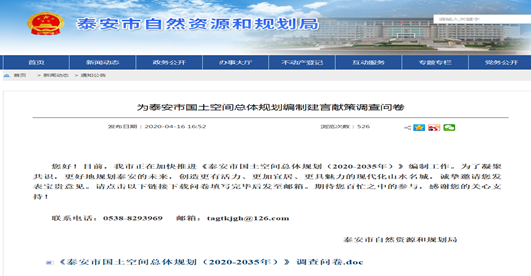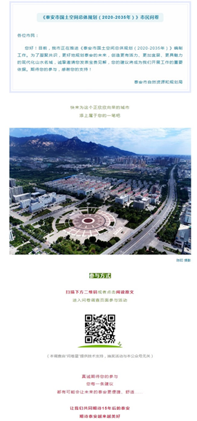 按照国家和省工作要求,泰安市正在推进《泰安市国土空间总体规划(2020-2035年)》编制工作,为提高规划编制的科学性,广泛征集群众意见建议,市自然资源和规划局通过官网及“泰山晚报”微信公众号发布《泰安市国土空间总体规划(2020-2035年)》市民问卷,同时给市党代会代表、人大代表、政协委员发送了参加问卷调查的邀请,向社会大众及代表、委员们征求未来15年泰安规划意见。人大代表就建立国土空间规划体系并监督实施方面,政协委员就城市建设、产业发展定位等方面分别提出具体意见建议。活动结束,共收到有效问卷3203份, 这些答卷内容和收到的意见建议,凝聚着广大市民及代表、委员的智慧和对泰安未来规划的共同美好期盼。