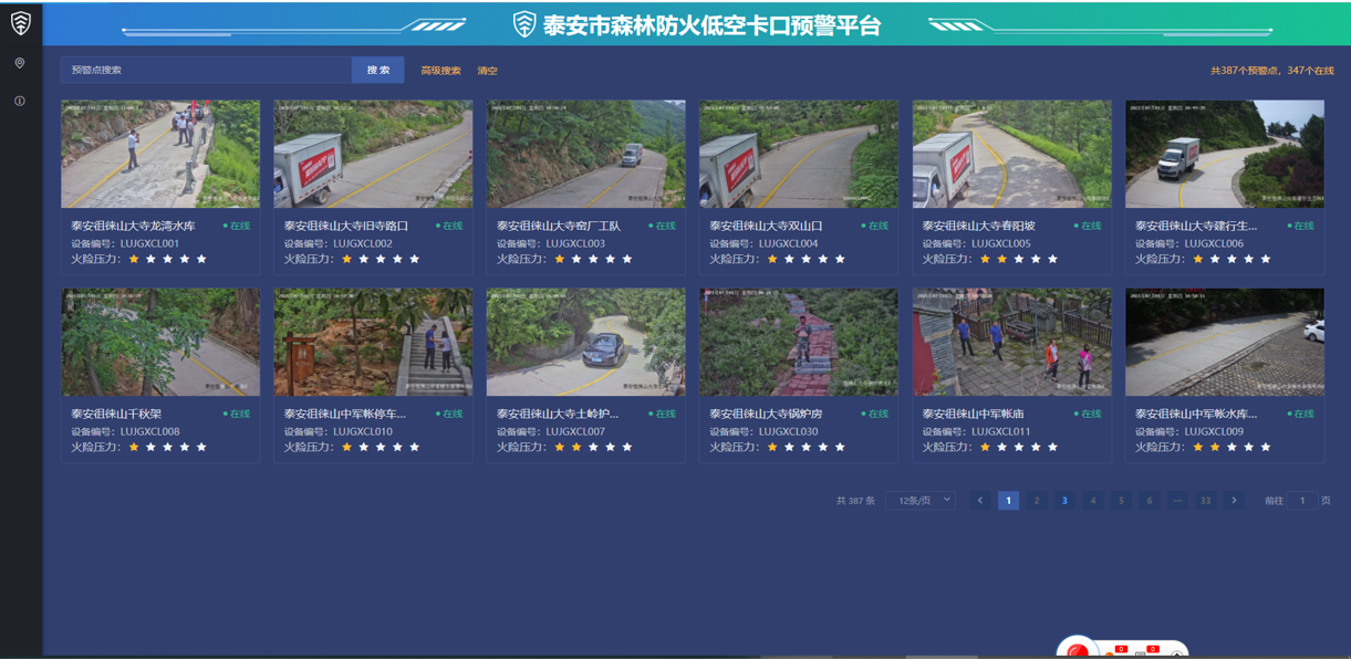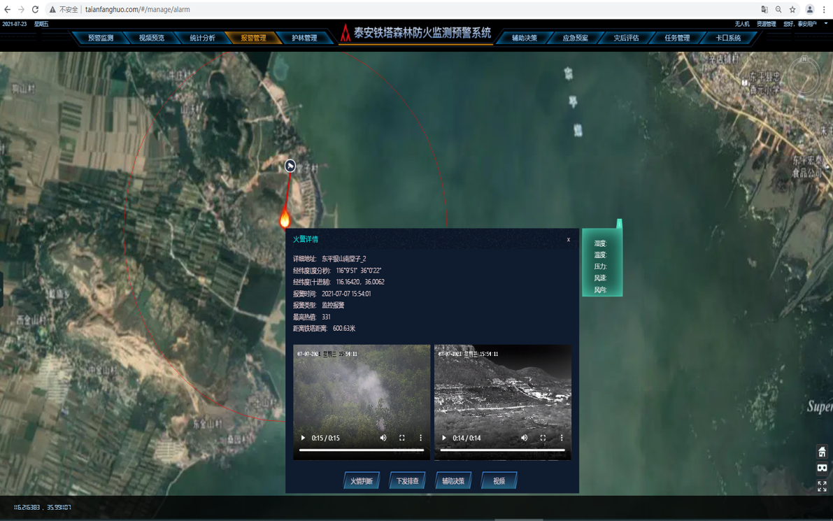 该系统能够实现火情自动发现、自动预警、自动定位、自动取证,再到护林员派单巡查、火势蔓延分析、资源调配、应急指挥调度、灾后评估的全流程闭环管理,有效提升了森林火情监测预警科技化、自动化、精准化水平,推进森林防火工作由人防向“人防+技防”的转变,基本实现了森林火情早发现、准定位、快处置,构建了泰安智慧防火体系。其次,系统的建成逐渐规范并改变林区居民的用火习惯,在启用“天眼护山”系统后,林缘周边焚烧垃圾、树叶、烧荒等违规用火行为大幅度减少,每天违规用火从30余次降低到0到3次,居民安全用火意识不断提升。系统上线以来,第一时间发现火情多起,有效协助制止违规用火行为。系统高点防火监测及低点卡口监控的分析与证据留存,为居民安全用火意识的宣传教育及林业行政执法、林区治安维护起到积极的促进作用。据统计,10月份有效报警16次,其中居民焚烧树叶4次,焚烧垃圾7次,违规用火1次,院内烧火4次。11月份有效报警22次,其中农历十一祭祀烧纸13次,焚烧树叶5次,焚烧垃圾1次,院内烧火3次。相比去年10-11月人工巡护情况,今年系统自动发现火情次数增加30%,均得到有效制止,违规用火行为减少40%左右,及时消除了火险隐患。
