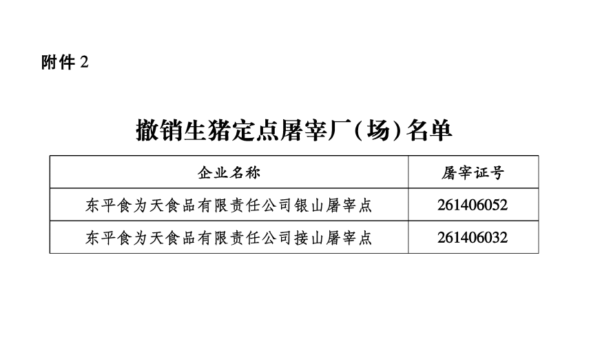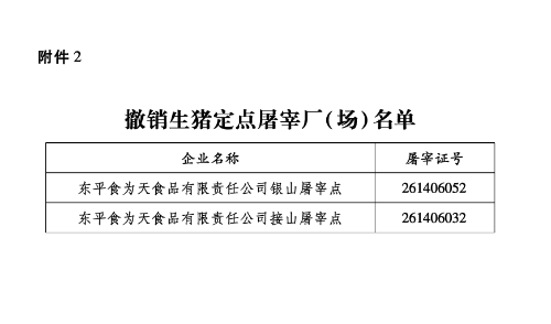 按照《生猪屠宰管理条例》有关规定,经有关部门联合审查,决定撤销东平食为天食品有限责任公司银山屠宰点等2家生猪定点屠宰厂(场)屠宰资格,准予核(换)发山东兴岳食品股份有限公司等12家生猪定点屠宰厂(场)牌证。现将有关企业名单予以公布。
