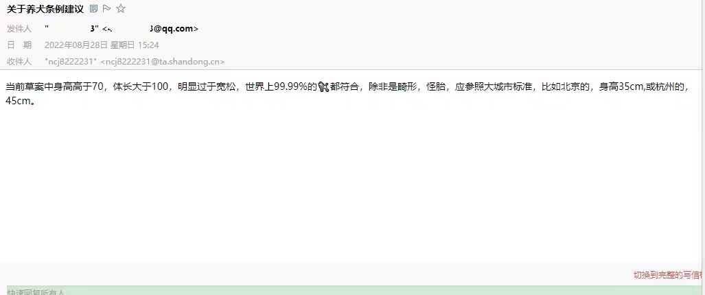 未完全采纳意见主要原因在于,一是将大型犬身高体长标准设计的过于严格不利于我市宠物行业的发展,二是养犬管理条例实施前,我市前期养犬登记工作已开展了一段时间,标准设计过严不利于工作的衔接。因此,我单位在借鉴周边地市经验的基础上,结合我市犬只饲养的实际情况,将大型犬的身高标准从70cm降低到了65cm。