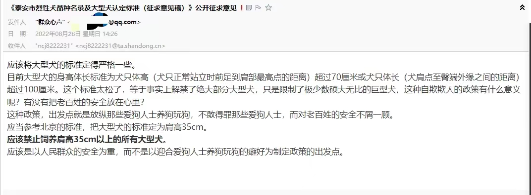 《根据《条例》第十二条规定,大型犬的身高体长标准及烈性犬的禁养品种名录由市农业农村部门会同市公安机关确定,并向社会公布。近日,市农业农村局、市公安局在前期调研的基础上,共同研究,初步确定了《泰安市烈性犬品种名录及大型犬认定标准(征求意见稿)》,现向社会公开征求意见。广大市民可将意见发送至电子邮箱ncj8222231@ta.shandong.cn。请在电子邮件主题上注明“《泰安市烈性犬品种名录及大型犬认定标准(征求意见稿)》公开征求意见”。