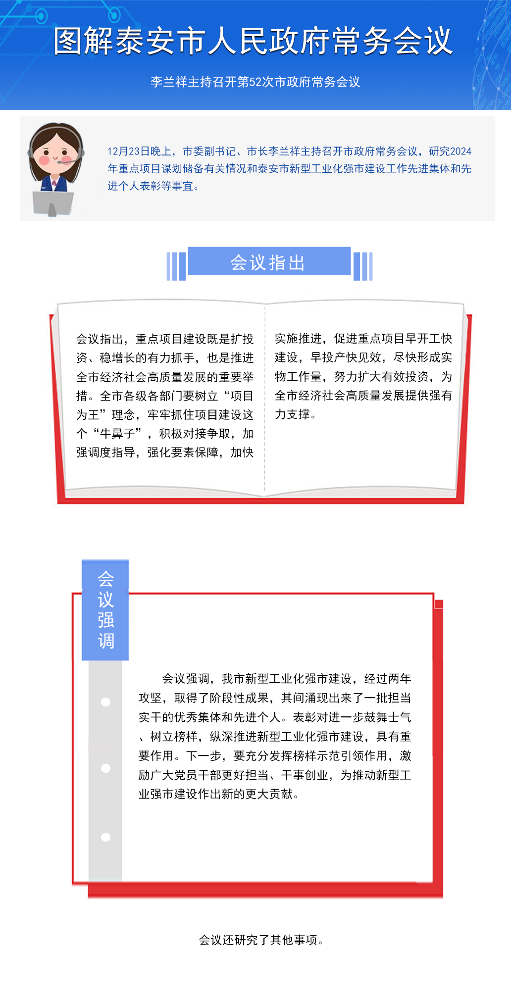 12月23日晚上,市委副书记、市长李兰祥主持召开市政府常务会议,研究2024年重点项目谋划储备有关情况和泰安市新型工业化强市建设工作先进集体和先进个人表彰等事宜。