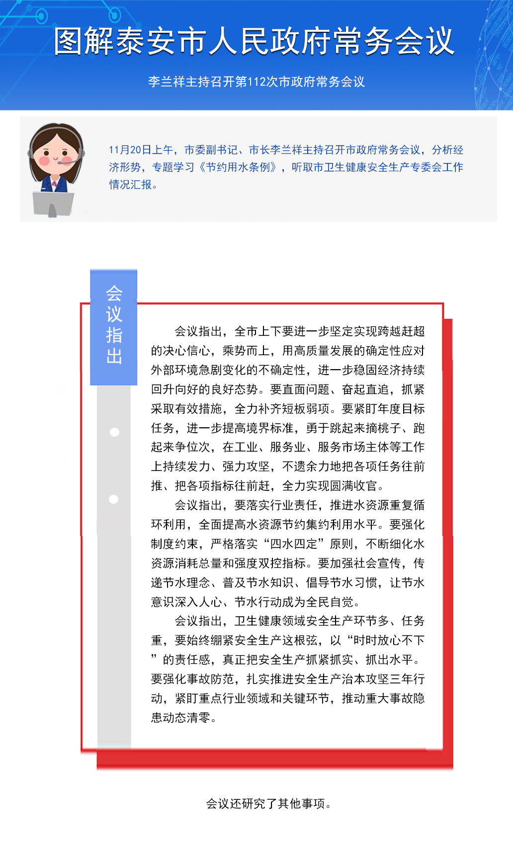 11月20日上午,市委副书记、市长李兰祥主持召开市政府常务会议,分析经济形势,专题学习《节约用水条例》,听取市卫生健康安全生产专委会工作情况汇报。
