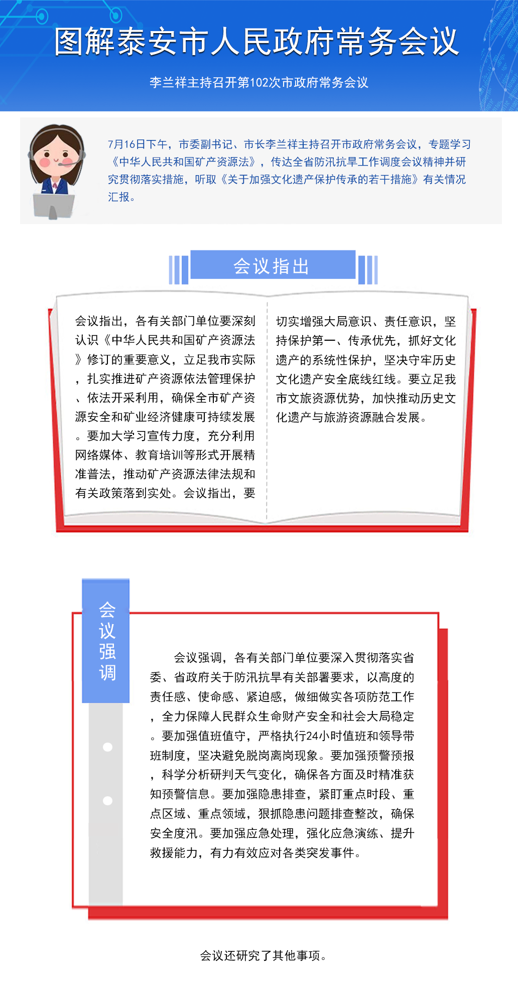 7月16日下午,市委副书记、市长李兰祥主持召开市政府常务会议,专题学习《中华人民共和国矿产资源法》,传达全省防汛抗旱工作调度会议精神并研究贯彻落实措施,听取《关于加强文化遗产保护传承的若干措施》有关情况汇报。