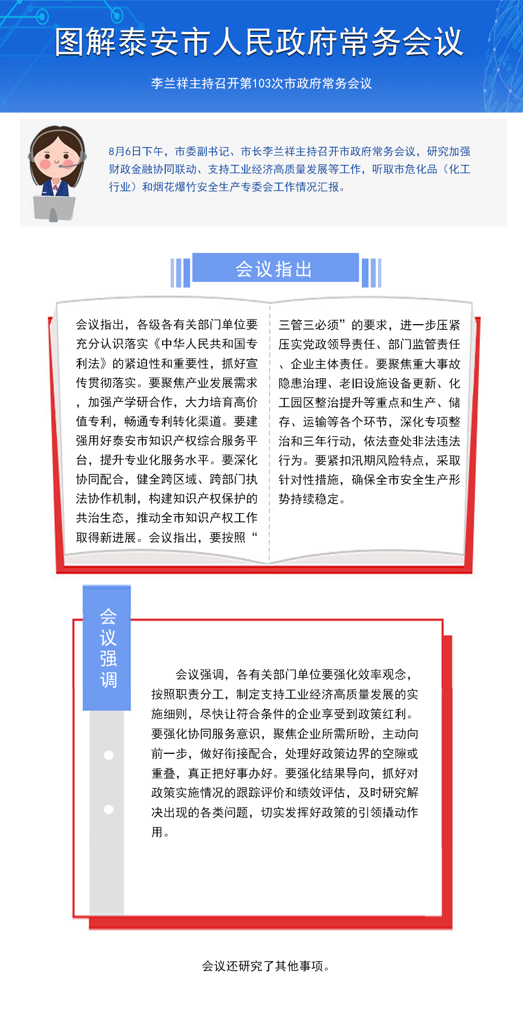 8月6日下午,市委副书记、市长李兰祥主持召开市政府常务会议,研究加强财政金融协同联动、支持工业经济高质量发展等工作,听取市危化品(化工行业)和烟花爆竹安全生产专委会工作情况汇报。