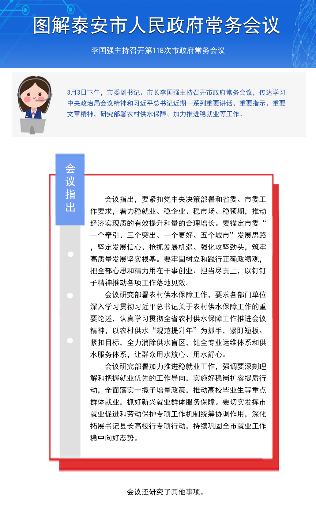 3月3日下午,市委副书记、市长李国强主持召开市政府常务会议,传达学习中央政治局会议精神和习近平总书记近期一系列重要讲话、重要指示、重要文章精神,研究部署农村供水保障、加力推进稳就业等工作。