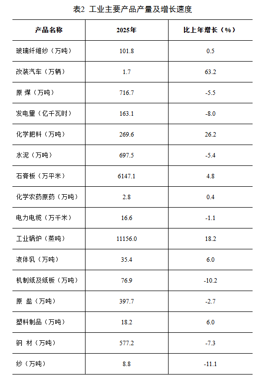 全部工业增加值1022.8亿元,按不变价格计算,比上年增长6.2%。规模以上工业增加值比上年增长7.8%,37个大类行业中有23个行业增加值实现增长,增长面为62.2%。规模以上工业企业实现营业收入2852.6亿元,下降4.1%;利润总额121.4亿元,下降5.9%。工业用电量205.7 亿千瓦时,增长4.6%。