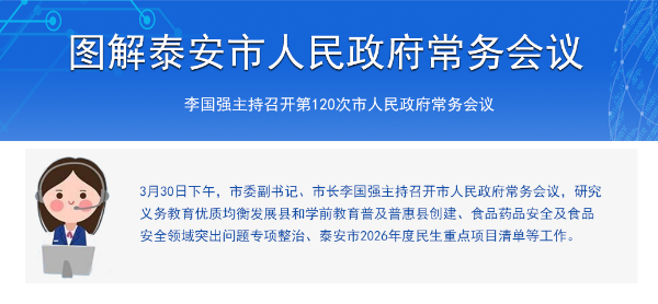 会议议题:研究义务教育优质均衡发展县和学前教育普及普惠县创建、食品药品安全及食品安全领域突出问题专项整治、泰安市2026年度民生重点项目清单等工作。