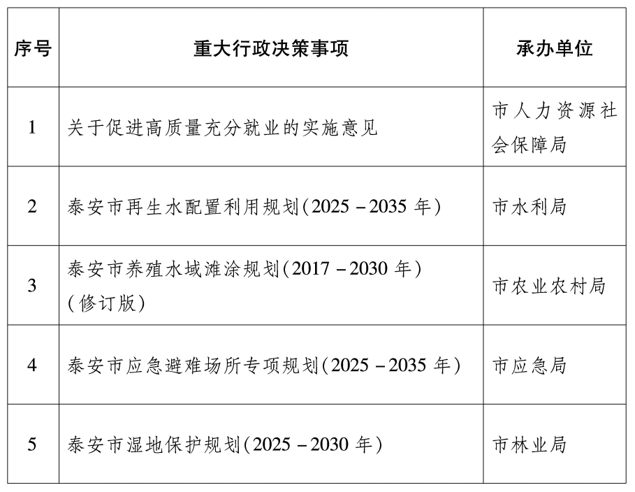 | 标??题: | 泰安市人民政府办公室关于公布泰安市人民政府2025年重大行政决策事项目录的通知 |