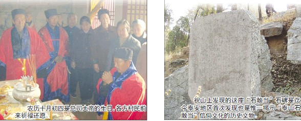 泰山及周边大大小小有价值的文物碑刻中没有发现一处记载“石敢当”由来的碑石,祝山的“石敢当”清代碑石,是迄今泰安地区首次发现也是惟一揭示“泰山石敢当”信仰缘由的历史文物,价值极大,祝阳也成为有史料记载的石敢当信仰文化的发源地。