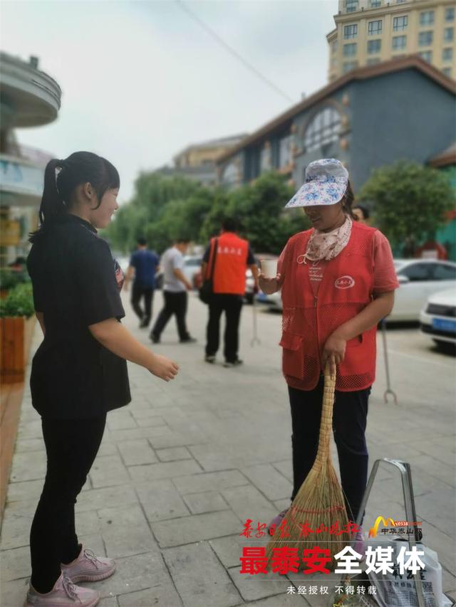 11时许,市民在室外走了不一会儿,就会出一身汗。“泰安小美”志愿者们在广场里,清扫台阶上的垃圾,向商户宣传创建全国文明城市的注意事项等。