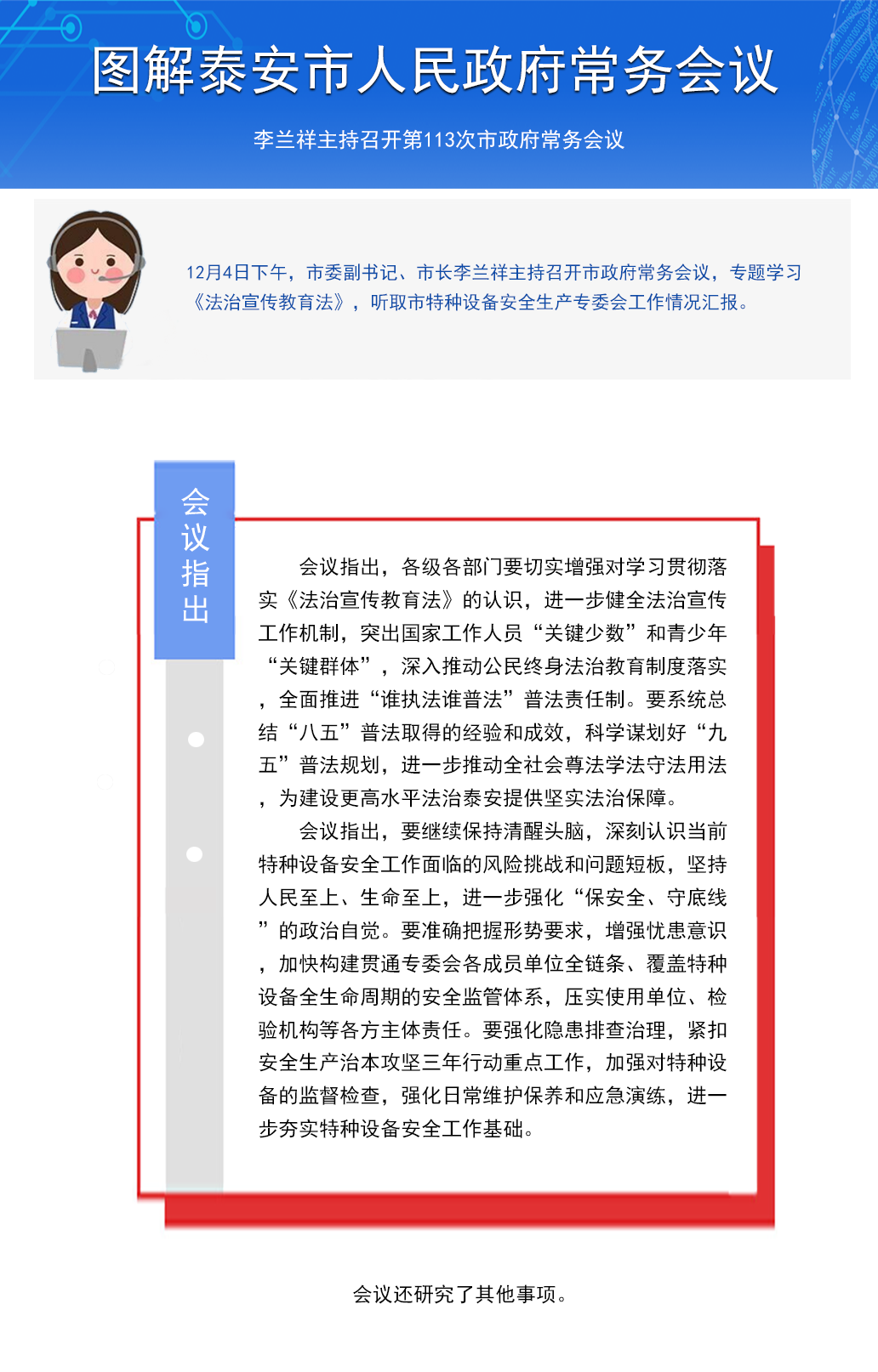 12月4日下午,市委副书记、市长李兰祥主持召开市政府常务会议,专题学习《法治宣传教育法》,听取市特种设备安全生产专委会工作情况汇报。